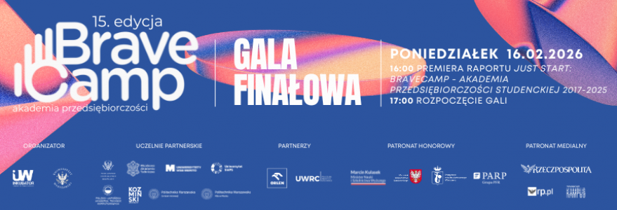 16 lutego w Starej Bibliotece na kampusie UW przy Krakowskim Przedmieściu odbędzie się gala finałowa XV edycji Akademii Przedsiębiorczości BraveCamp, realizowanej przez Inkubator Uniwersytetu Warszawskiego. Wydarzenie poprzedzi prezentacja raportu podsumowującego osiem lat funkcjonowania programu.