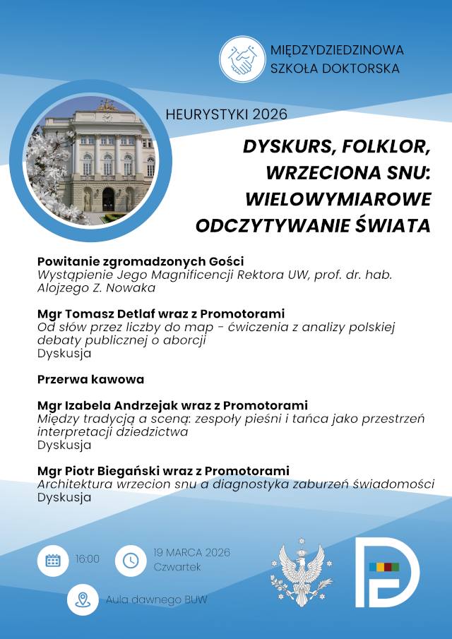 19 marca w Auli Starej Biblioteki na Kampusie Głównym Uniwersytetu Warszawskiego odbędzie się kolejne spotkanie z cyklu „Heurystyki”. Podczas wydarzenia zatytułowanego „Dyskurs, folklor, wrzeciona snu: wielowymiarowe odczytywanie świata” doktoranci przedstawią międzydziedzinowe projekty prac naukowych.