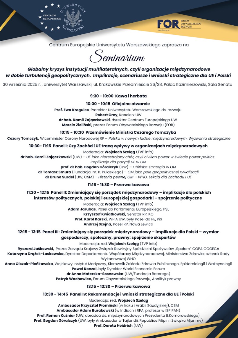 30 września w Sali Senatu Pałacu Kazimierzowskiego UW odbędzie się seminarium pt. „Globalny kryzys instytucji multilateralnych, czyli organizacje międzynarodowe w dobie turbulencji geopolitycznych. Implikacje, scenariusze i wnioski strategiczne dla UE i Polski”.