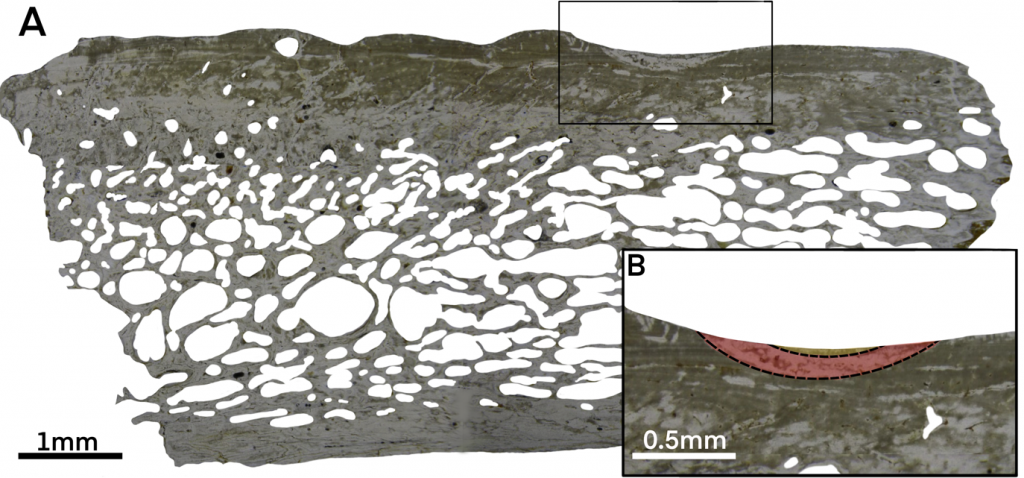 Wybrane płytki z pancerza żółwi naukowcy pocięli na cienkie fragmenty, a następnie utworzyli z nich preparaty, które później analizowali pod mikroskopem. Każdy przekrój przez pancerz przebiegał przez zagłębienia. Okazało się, że niektóre zagłębienia wypełnione są nowymi warstwami tkanki kostnej – śladami regeneracji pancerza po jego uszkodzeniu – co, jak dowodzą badacze, świadczy o tym, że zagłębienia w pancerzu powstawały za życia żółwi. Prawdopodobnie zagłębienia utworzyły morskie bezkręgowce, które żyły na pancerzach żółwi.