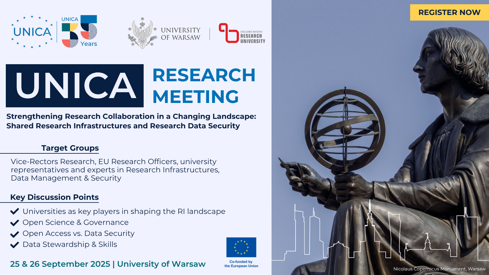O współpracy badawczej w zmieniającym się środowisku oraz bezpieczeństwie danych naukowych rozmawiać będą przedstawiciele ponad 50 uczelni zrzeszonych w sieci UNICA. Dwudniowe spotkanie na Uniwersytecie Warszawskim rozpoczęło się 25 września. Obowiązuje rejestracja.