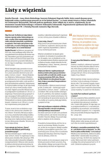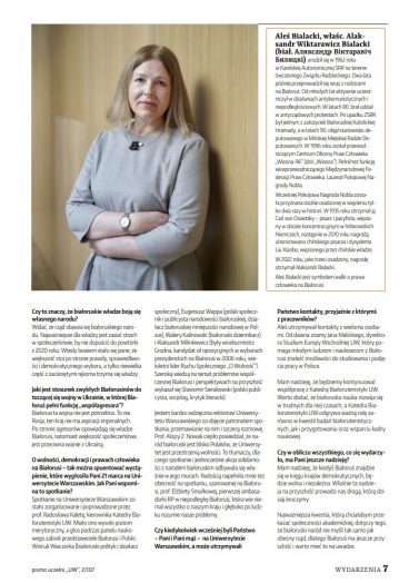 W marcu 2023 roku Uniwersytet Warszawski odwiedziła żona Alesia Bialackiego. Przypominamy rozmowę z Natalią Pinczuk, Wywiad ukazał się na łamach pisma uczelni „UW”. Pełna treść wywiadu jest dostępna w piśmie uczelni „UW” (nr 2/107, 2023, s. 6 i 7).
